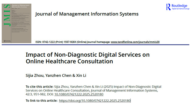 近期,性爱影片 电子商务系周思佳老师与合作者在FT50期刊《Journal of Management Information Systems》在线发表学术论文“Impact of Non-Diagnostic Digital Services on Online Healthcare Consultation”。